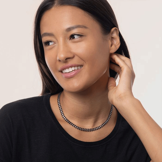 Collana modello girocollo piccole foglie nere. Chiusura regolabile con moschettone. Placcato in argento. Nickel tested. Lavorazione artigianale.