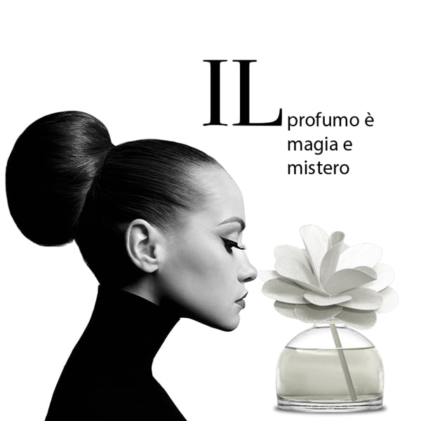 Una raffinata Confezione in bottiglia di vetro, con diffusore a forma di fiore in legno di betulla realizzato a mano.